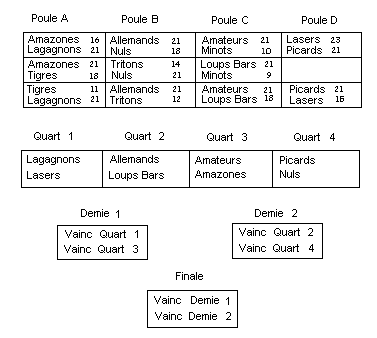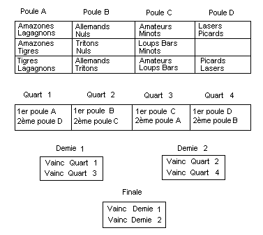 La poule B était composée des Nuls, des Allemands et des Tritons. Dans la poule C il y avait les Minots, les Loups-Bars et une dernière équipe de trois jeunes qui apparemment ne se connaissaient pas et que l’organisateur avait regroupé : les Amateurs. La dernière poule ne comprenait que deux équipes qui devaient se rencontrer en matchs aller-retour : les Lasers et les Picards.