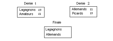 Quand ils furent remis de leurs émotions, après avoir bu chacun une bonne dose d’eau minérale, les trois amis convinrent d’observer attentivement la seconde demi-finale. Celle-ci fut à sens unique, les Allemands ne laissèrent aucune chance aux Picards et s’imposèrent par 21 à 13.